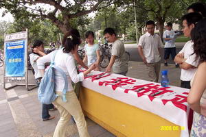 2006年6月14日中午,由应用数学学院研究生三个年级党支部联合发起的“诚信学术 从我做起”签名活动在学校阳光餐厅门外举行,近200多名学生在“诚信学术 从我做起”的横幅上庄重...