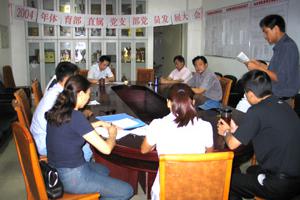 <?xml:namespace prefix = st1 ns = "urn:schemas-microsoft-com:office:smarttags" />2004年7月1日上午9:00,体育部直属党支部召开支部大会,会议讨论并通过了彭福栋同志加入中国共产党的申请。通过...
