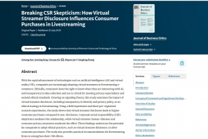 近日,经管学院2023级工商管理学专业博士研究生韩林彤在方佳明教授指导下完成的研究成果“Breaking CSR Skepticism: How Virtual Streamer Disclosure Influences Consumer Purchases in Livestreaming”在线发...