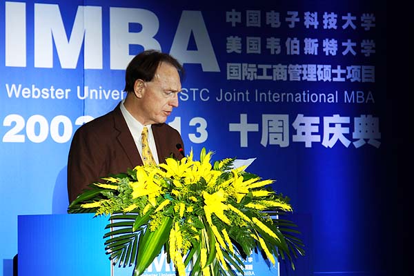 曾勇、Richard Foristel博士和总领事Peter Haymond博士分别致辞,表达了对项目的祝贺,希望项目可以持续发展,再造下一个十年的辉煌。美国韦伯斯特大学校长和商学院院长也通过VCR从遥远的美国传来对IMBA项目的祝贺与祝福。