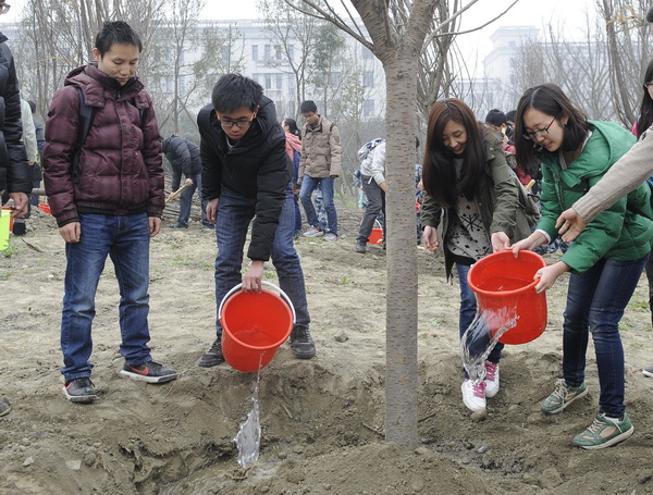 光电学院大二学生郝文嫤说,参加植树活动不仅可以美化校园环境,积极践行低碳生活,同时还能增进同学们之间的友谊,传递正能量。她说,相信通过大家的共同努力,在不久的将来,湖畔将会形成落英缤纷的美景,学校环境会更好。
