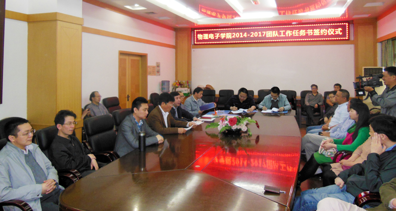 4月21日上午,物电学院举行2014-2017年团队目标考核工作任务书签约仪式。本次签约的团队共计16个,其中科研团队11个,教学团队5个。院长蒙林分别与16个团队的负责人签订工作任务书。