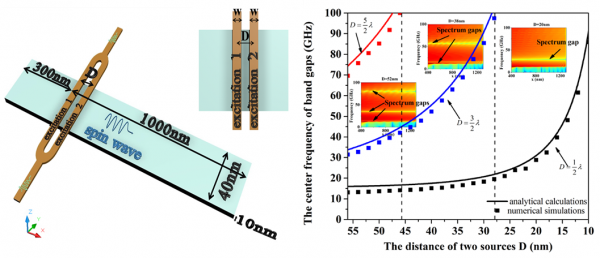 微波器件小型化在云数据时代是一个挑战。自旋调控器件是全面实现微波有源和无源集成器件向微米、纳米尺寸过渡的有效途径。王棋博士生通过建立二维磁振子晶体理论模型,首次提出了多激励源激发自旋波干涉调控自旋波禁带宽度的思想,为动态调控自旋波提供一种可行之法,也为未来的纳米波、毫米波器件以及集成系统奠定一种行之有效的理论方法。Sci. Rep. 审稿人评价:“用干涉法调控自旋波禁带,有较大的优势,提供了一种新的调控自旋波的思路。”Appl. Phys. Lett.评审人评价:“此工作第一次详细报道极化电流对磁振子晶体的调控,是一篇高质量具有物理应用潜力的论文。”