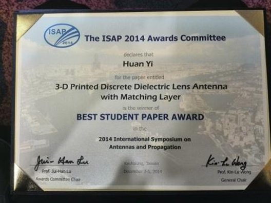 12月2日-5日,2014国际天线与传播会议( International Symposium on Antennas and Propagation,简称ISAP 2014)在台湾高雄举办,我校电子工程学院博士生易欢的学术论文“3-D Printed Discrete Dielectric Lens Antenna with Matching Layer”获得“最佳学生论文奖”(Best Stuident Paper Award)。易欢和另外两位分别来自日本东京工业大学和台湾逢甲大学的学生一道,成为仅有的三名获奖者。