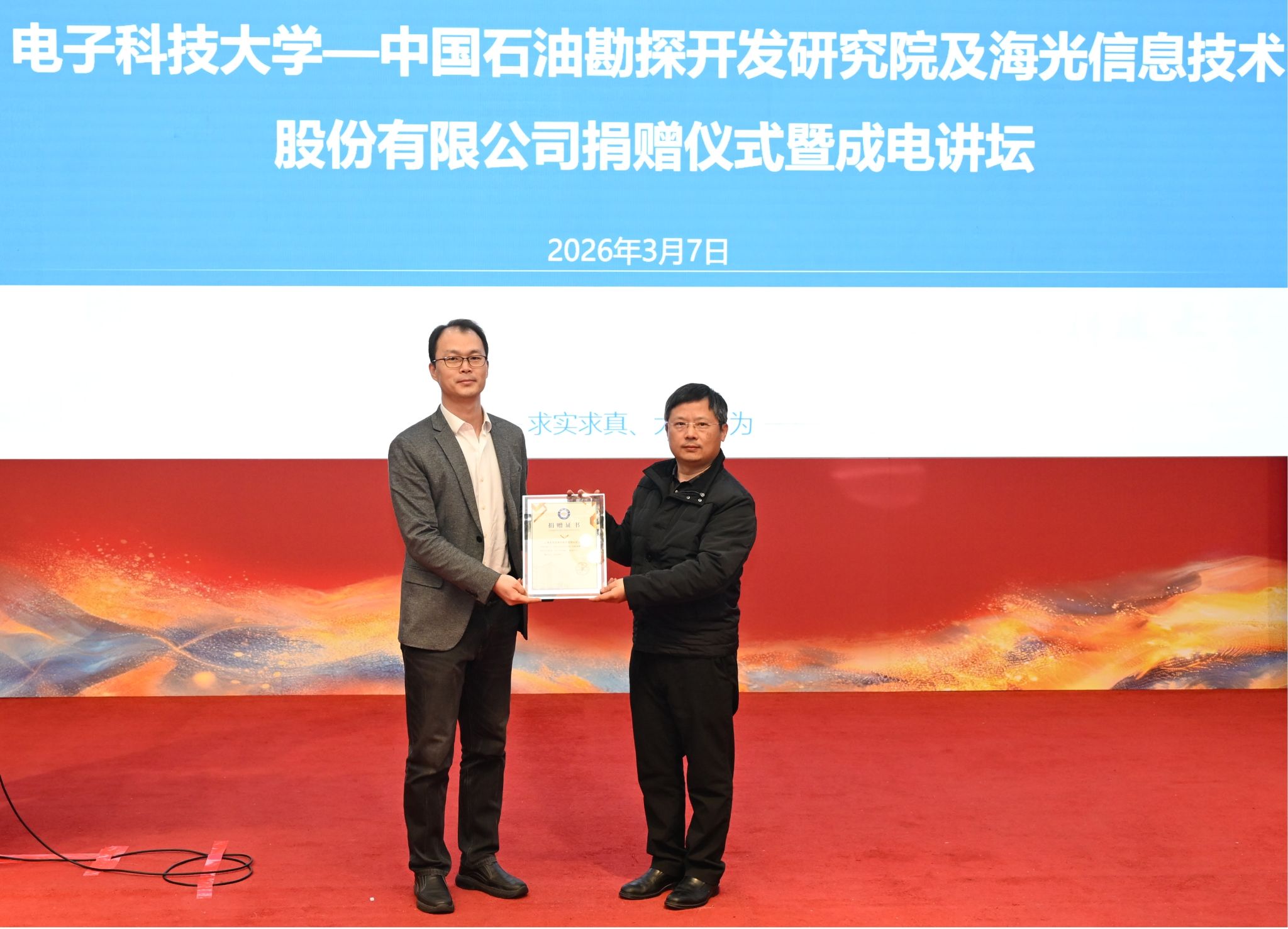 中国石油勘探开发研究院、海光信息技术股份有限公司、北京东晨联创科技股份有限公司相关负责人,学校合作发展部、国资处、大学生文化素质教育中心、资环学院有关负责人出席捐赠仪式,共同聆听了“成电讲坛”的讲座报告。