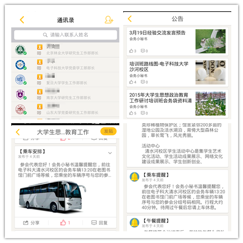 会议期间,通过面聊“公告”板块,代表们可实时查看会议重要通知,了解会议实时动态;通过“通讯录”板块可以了解参会代表所在单位、职务、联系方式等;通过“面团”板块则方便了解电子科大两校区环境、周边美食、校园地图以及下载资料;“系统消息”板块则能为代表们推送天气预报、乘车安排等实用信息,知悉成电校园生活。来自复旦大学、中国政法大学等高校的参会代表纷纷表示,“面聊”不但是一个开展学生工作的平台,也是举办会议的“好帮手”。