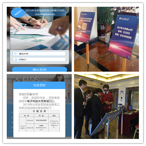 3月18日是2015年大学生思想政治教育工作研讨培训班报到的日子,来自全国各重点高校的140多位学工部、研工部长陆续到会。当代表们到达会议报到地点——电子科技大学宾馆一楼大厅时,发现现场没有了以往会议报到常见的纸质签到台,代替的是两个印有二维码的电子签到架。代表们只需使用手机扫描“二维码”便可“一键签到”。“使用起来非常方便,还能查看房间号,查找我认识的其他代表的报到情况。”前来报到的天津大学代表说。