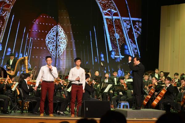 校合唱团指导老师携部分同学带来《万泉河水清又清》《菊花台》等经典曲目,将现场气氛推向高潮。一曲《芬兰颂》将晚会带入尾声。伴随着观众热烈的掌声,返场曲目《小苹果·变奏曲》《最炫民族风·变奏曲》更是迎来满堂喝彩。