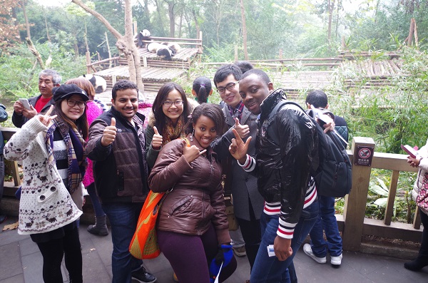 除了参与外宾接待,大使团的同学们通过多种活动,加强与我校留学生的沟通交流。近日,大使团部分团员与我校20余名留学生一起参观成都大熊猫繁育研究基地,零距离感受国宝魅力。大使们不仅充当了临时讲解员,还帮助留学生们练习中文,耐心解答留学生的各种问题。中外学子还分享了各自国家丰富多彩的风俗文化。