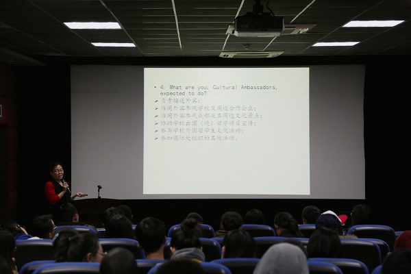 为帮助文化交流大使提升工作水平,国际合作与交流处还开展了系列培训讲座。国际合作与交流处处长邸爱英教授带来首次培训,详细介绍了我校历史、现状,特别是国际合作与交流方面的情况。她说,文化交流大使的使命在于提升校内跨文化交流氛围,对外宣传成电、成都、中国,同时帮助同学们拓展全球视野、增强文化自信、提升综合素质。接下来,国际合作与交流处还将组织开展学校出国留学项目介绍、学校留学生情况介绍、图书馆使用、仪态形体等一系列培训活动。