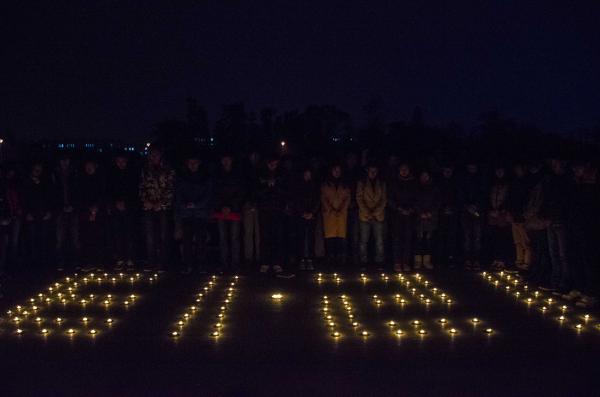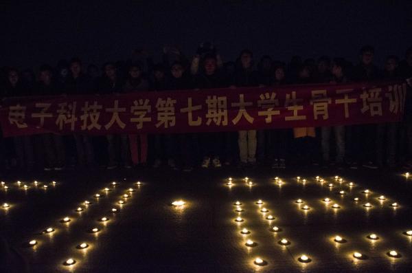 “南京,我们没有忘记!”1213日晚,清水河校区时间广场上空回荡着慷慨激愤的诗歌——《南京,我们没有忘记》。“当年长江那血红的怒吼声,我们没有忘记;当年日寇杀人后的狞笑声,我们没有忘记!”祈愿蜡烛摆成“1213”的形状,告慰南京大屠杀中逝去的30万无辜生命。自发聚集的同学们静静肃立,为30万死难同胞默哀。三分钟默哀后,同学们高唱《义勇军进行曲》。