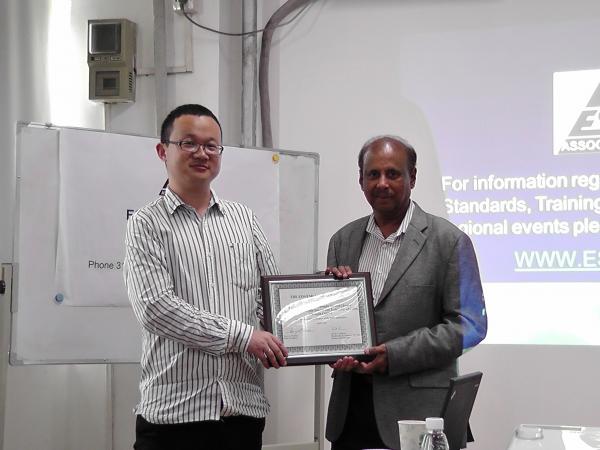 Dr. Charvaka Duvvury代表ESDA,为刘志伟老师和ESDA成都学生分会主席董艾华同学授予证书。