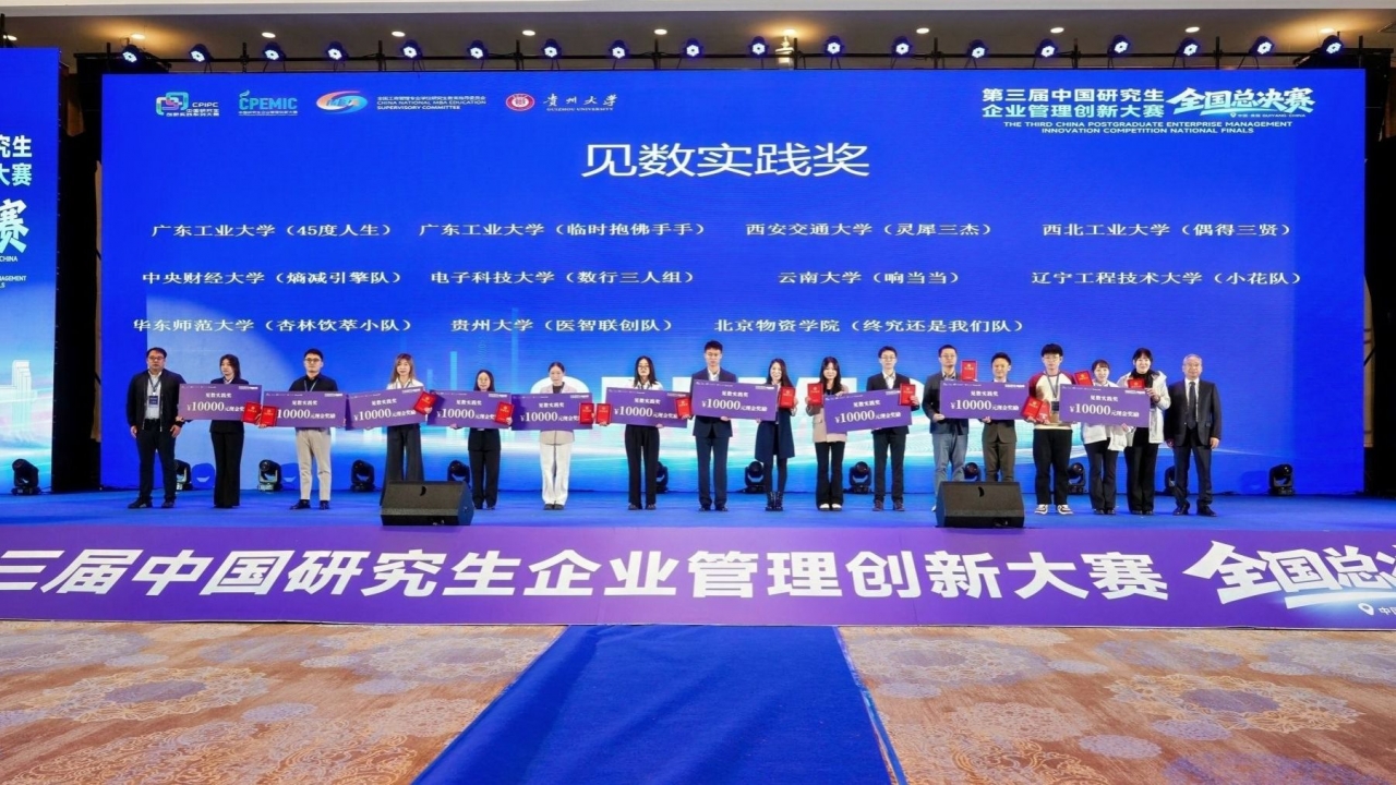 11月8-9日,第三届中国研究生企业管理创新大赛全国总决赛在贵阳圆满落幕。本届大赛共有来自全国150所高校的411支队伍晋级全国总决赛。电子科技大学参赛队伍荣获一等奖2项,二等奖7项,三等奖3项;学校连续三年获评“优秀组织奖”。其中一等奖获奖团队“数行三人组”同时获“见数实践奖”。我校一等奖数量及获奖总数均位列全国前10%,展现出卓越的创新实力与团队风采。