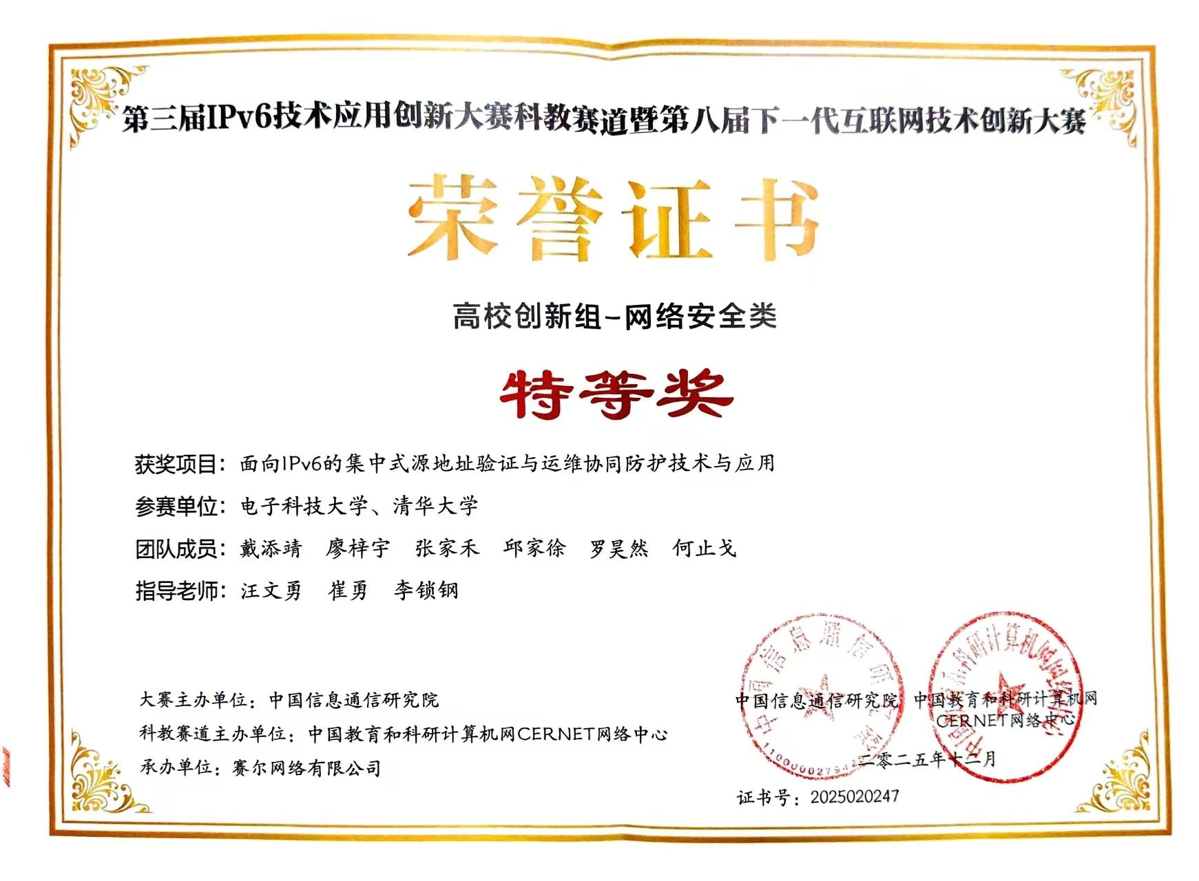 在中国教育和科研计算机网CERNET网络中心主办的第三届IPv6技术应用创新大赛科教赛道暨第八届下一代互联网技术创新大赛中,我校牵头完成的项目《面向IPv6的集中式源地址验证与运维协同防护技术与应用》从全国决赛60个项目中脱颖而出,获特等奖。
