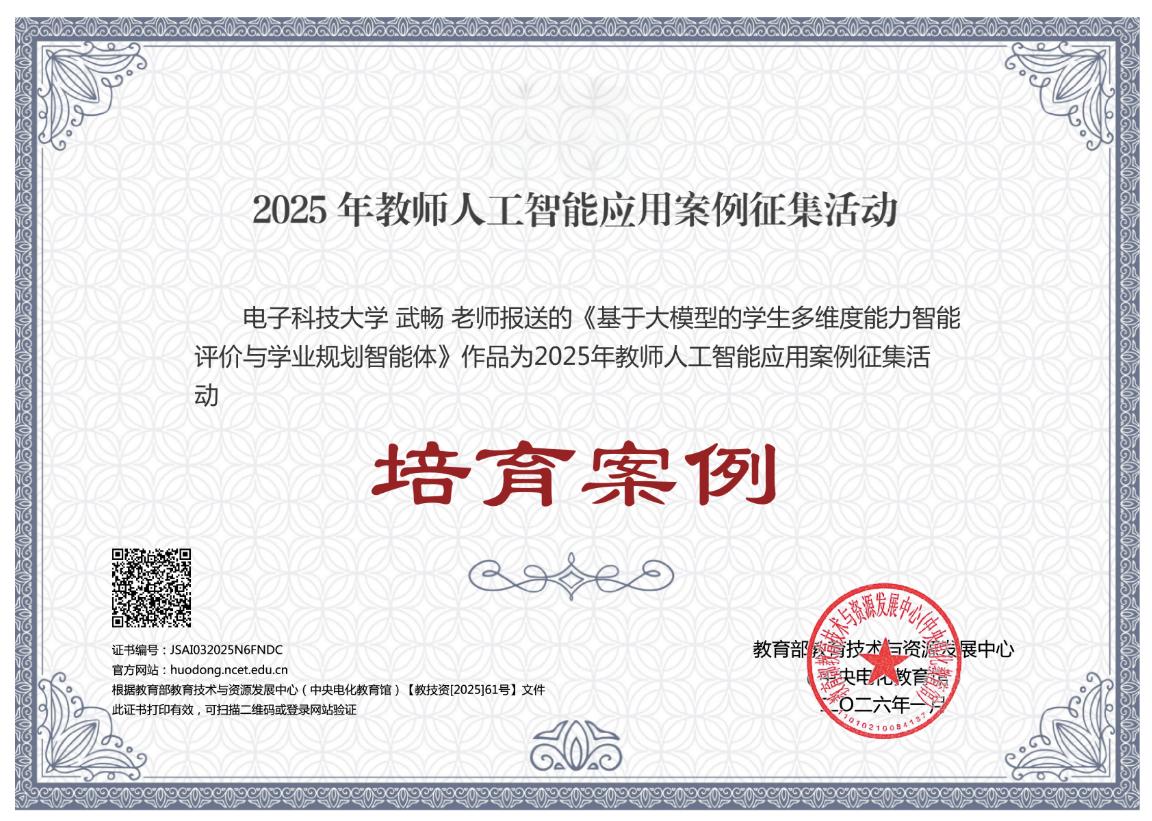 在四川省教育厅组织开展的国家智慧教育平台应用案例及数字校园应用场景典型案例评选中,《数据融通,AI赋能,生态开发——电子科技大学“成电资源”智慧教育平台的应用实践》,及《多源数据驱动的智能化学情分析系统实践》获评高等教育十大典型案例。其中,“成电资源”平台打造集资源整合、智能教学、个性推荐与双向输出于一体的智慧教育新范式;多源数据驱动的学情分析系统则全方位辅助教师的教学评价,涵盖“多源数据融合”、“宏观班级决策”与“微观个性化诊断”三个维度。学校另有多个项目获评优秀案例。