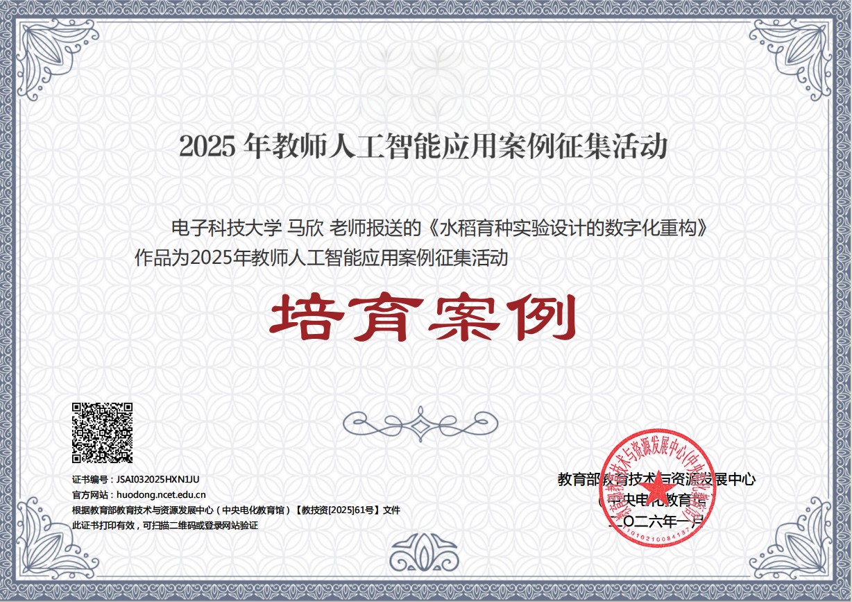 在教育部教育技术与资源发展中心(中央电化教育馆)举办的2025年教师人工智能应用案例征集活动中,经学校组织申报遴选、四川省推荐,我校两项成果入选国家级培育案例,分别为《水稻育种实验设计的数字化重构》与《基于大模型的学生多维度能力智能评价与学业规划智能体》。