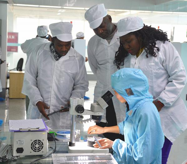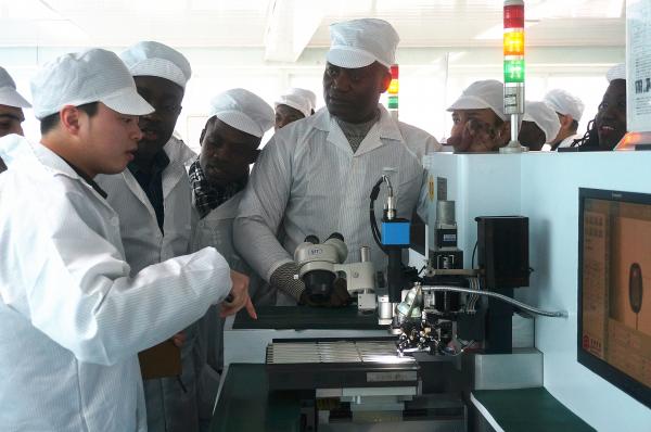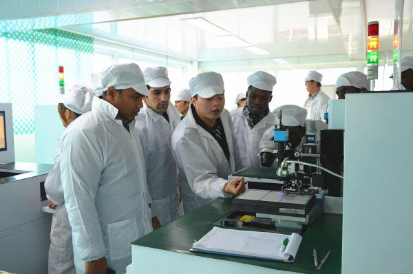 师生参观了企业的生产车间,详细的了解LED灯具的生产流程和关键技术。参观结束后,埃塞留学生Kusse非常兴奋地跟公司销售刘鹏总经理交流,感谢公司提供的参观机会让自己了解了专业的前沿发展,更兴奋自己的祖国马上就将有生产基地。加纳留学生Alfred对企业合作非常感兴趣,希望能有机会将中国的先进技术带回非洲,自主创业,做半导体照明行业领军人物。