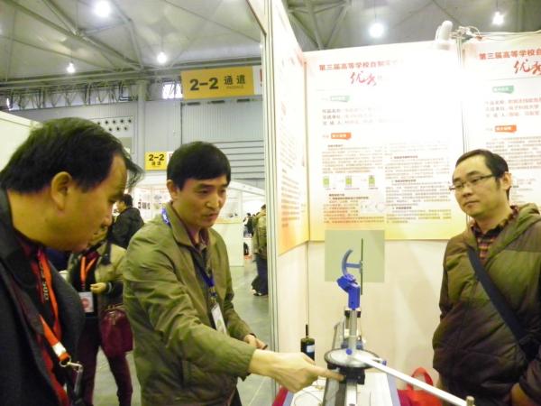 在展示评选会上,相关高校对我校的自制设备表现出较高的关注度。李玉柏、杨德强、陈瑜、唐续、蒋泉等老师与兄弟院校的同仁们进行了深入交流。他们耐心讲解、反复演示,积极推广,得到评委及兄弟院校的一致好评。