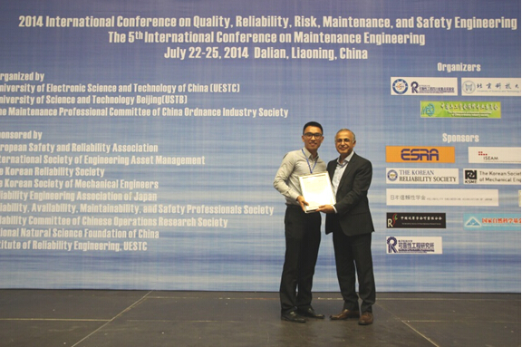 在经过大会论文评审和考察等环节综合评出的上一届QR2MSE国际学术会议 (QR2MSE 2013) 最佳论文中,黄洪钟教授指导的博士研究生彭卫文等撰写的论文“基于逆高斯过程和贝叶斯方法的加速性能退化试验设计方法研究” (W.W. Peng, H.-Z. Huang, Z.L. Wang, Y. Liu, S.-P. Zhu. A study on Bayesian design of degradation tests with the Inverse Gaussian processes.) 受到与会专家评委们的高度评价,荣获QR2MSE 2013最佳学生论文奖。论文从高可靠长寿命产品的性能退化试验设计问题入手,针对性能退化建模中新提出的逆高斯过程模型,应用贝叶斯优化决策方法对性能退化试验设计方法进行了研究,对高可靠长寿命产品的性能退化建模与性能退化试验设计的研究和应用意义显著。