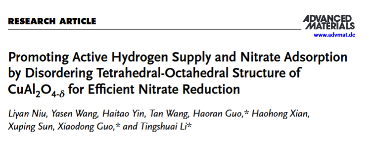 近日,材料与能源学院2022级新能源材料与器件专业本科生牛立言在Advanced Materials上发表了题为“Promoting active hydrogen supply and nitrate adsorption by disordering tetrahedral-octahedral structure of CuAl2O4-δ for efficient nitrate reduction”的研究论文(中科院一区,影响因子27.4),电子科技大学材料与能源学院为第一单位,牛立言同学为第一作者。