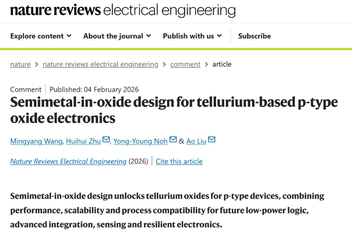 近日,基础与前沿研究院/电子薄膜与集成器件全国重点实验室刘奥团队受邀在Nature综述系列期刊Nature Reviews Electrical Engineering发表前沿评论文章,梳理了团队近年来在“p型氧化物电子学”领域的研究进展,阐述了半金属-氧化物新材料体系的物理内涵与器件发展思路,并对该领域未来研究方向进行了展望。电子科技大学为论文第一完成单位,基础与前沿研究院王名扬博士后为论文第一作者。