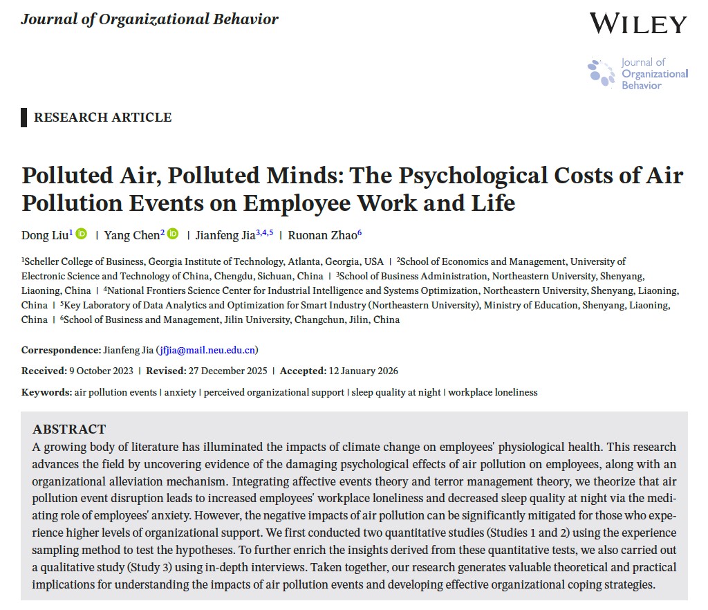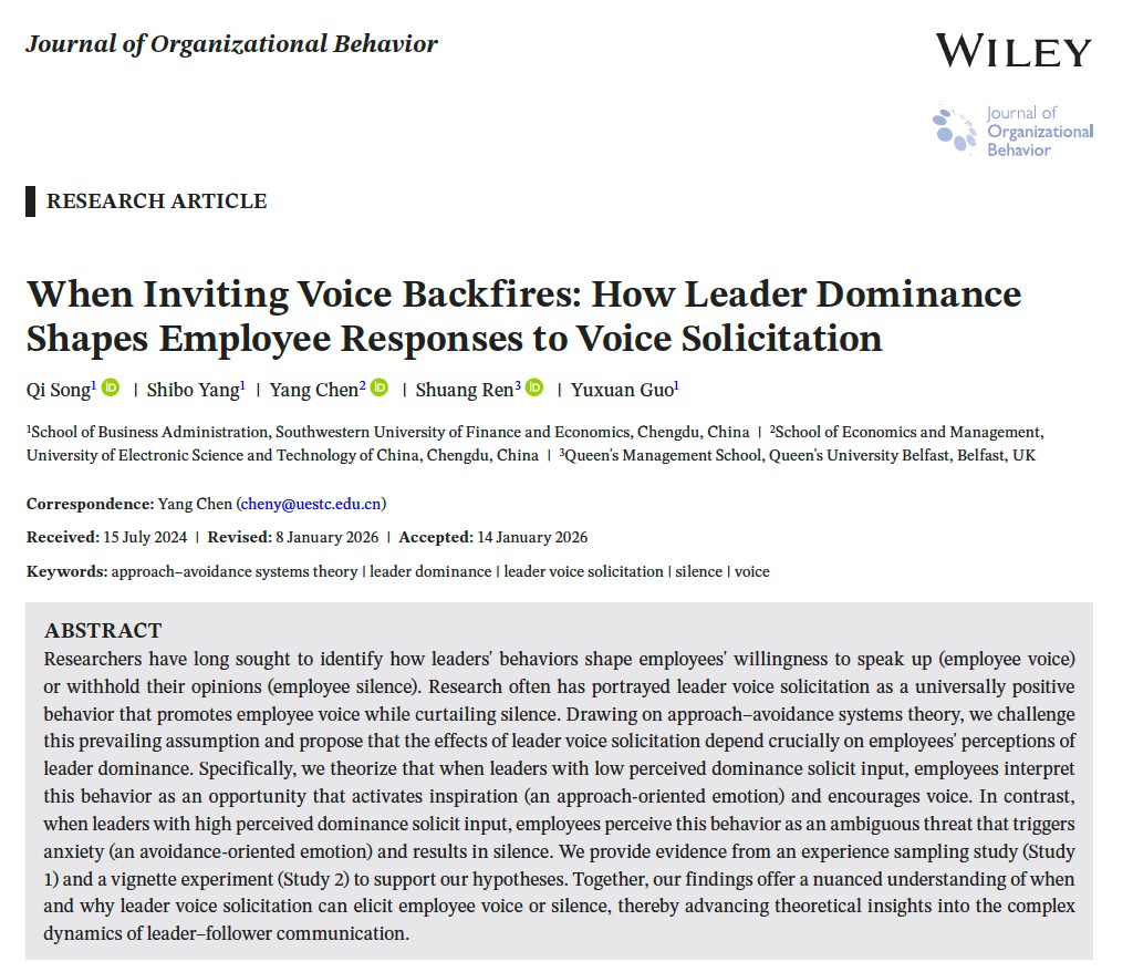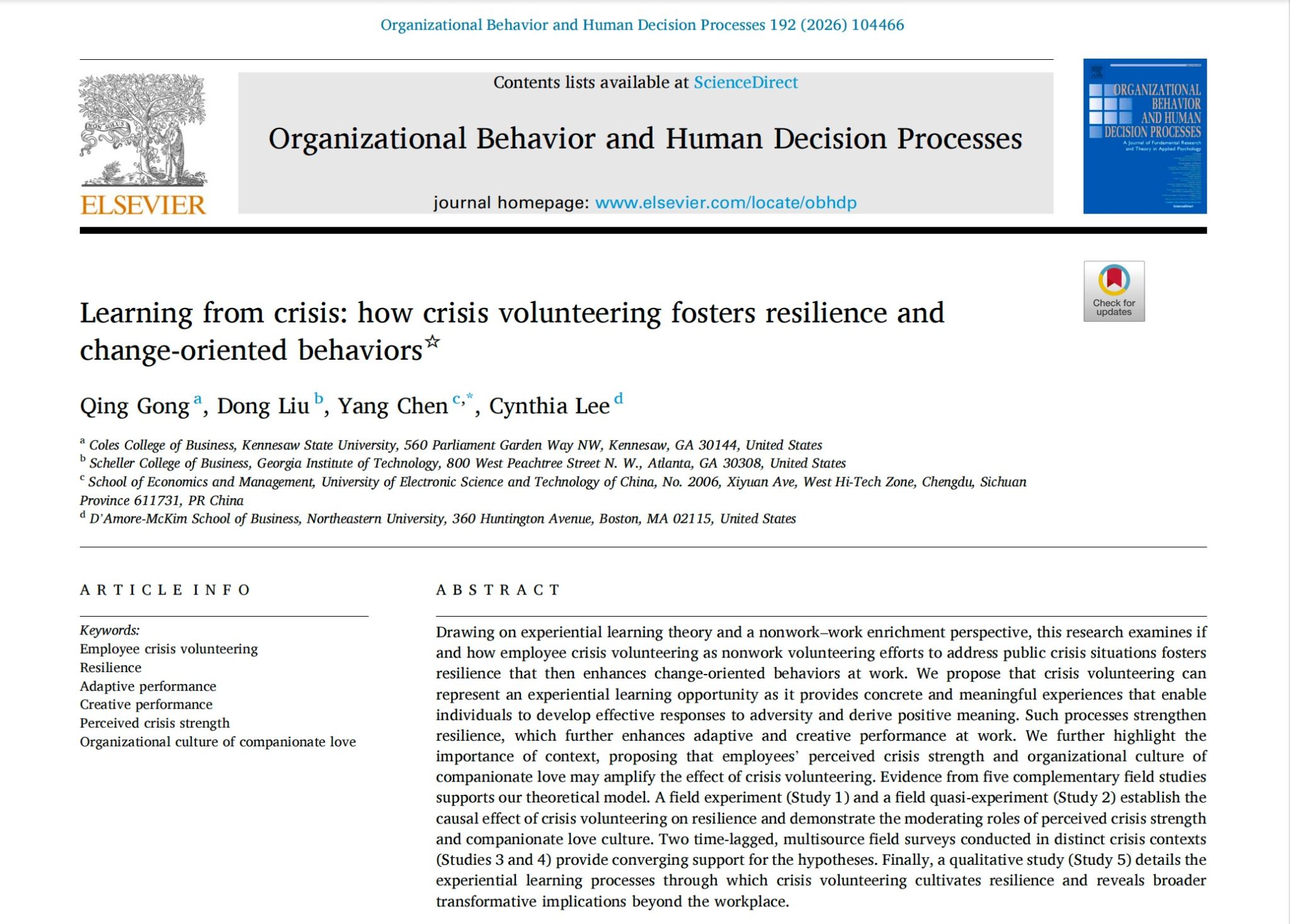 2026年2月,电子科技大学经济与管理学院陈扬教授团队相继在国际A类期刊Organizational Behavior and Human Decision Processes(简称OBHDP)与Journal of Organizational Behavior(简称JOB)在线发表3篇研究成果(OBHDP 1篇,JOB 2篇),分别是“Learning from crisis:“How crisis volunteering fosters resilience and change-oriented behaviors”(以下简称“论文1”),“When inviting voice backfires: How leader dominance shapes employee responses to voice solicitation”(以下简称“论文2”)和“Polluted air, polluted minds: The psychological costs of air pollution events on employee work and life”(以下简称“论文3”)。陈扬教授是论文1的通讯及共同第二作者、论文2的通讯及第三作者、论文3的第二作者。