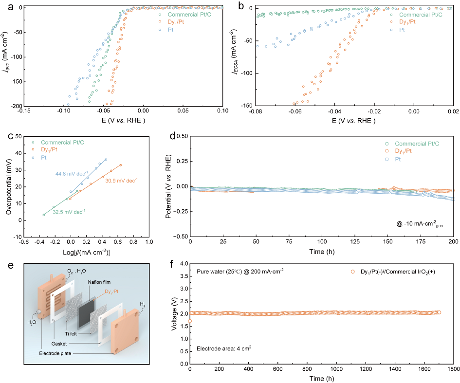 在0.5 MH2SO4中评估了Dy1/Pt的酸性HER性能。LSV测试显示,Dy1/Pt在10 mA cm-2时仅需20 mV过电位,优于商业Pt/C(27 mV)和纯Pt纳米颗粒(24 mV)。经过DFT计算,Tafel斜率测量和ECSA归一化极化曲线比较,进一步证实了Dy1/Pt的优异本征活性。此外,Dy1/Pt在质子交换膜电解水器件中表现出超过1700小时的优异稳定性(图5)。