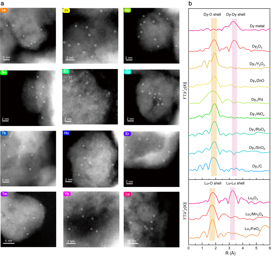 将合成方法扩展至更具挑战性的贵金属基底。一方面利用乙酰丙酮盐在熔盐中可起到还原作用,另一方面利用高粘度熔盐阻碍烧结现象,结合熔盐屏蔽效应,即使在空气中也能形成镧系单原子分散的金属纳米颗粒(图3)。进一步将合成方法扩展至其他镧系元素(La, Pr, Nd, Sm, Eu, Gd, Tb, Ho, Er, Tm, Yb, Lu),成功制备了Ln1/Cu催化剂。同时也可将基底范围扩展至Y2O3、ZnO、Pd、AlOx、RuO2、SnO2、FeOx、Mn3O4以及商业碳黑,HAADF-STEM以及EDS元素分布结果均证实了镧系元素的均匀分布。EXAFS中Ln-Ln配位层的缺失证实了所有样品的单原子结构(图4)。