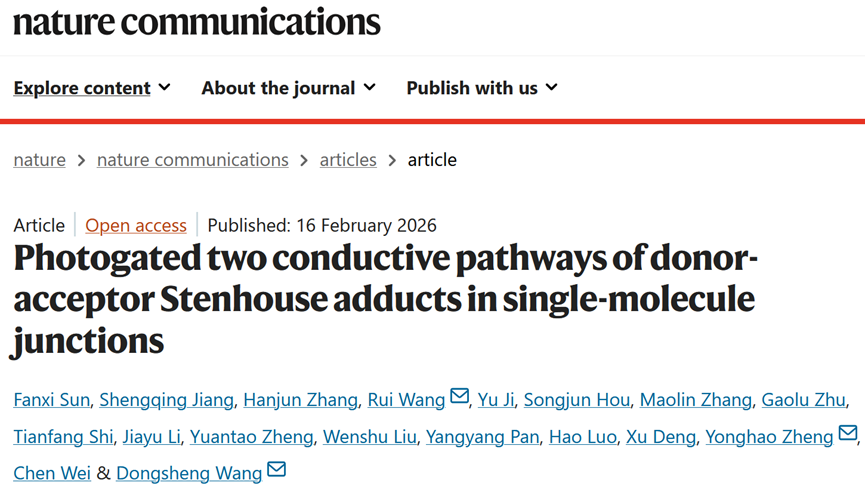 近日,光电科学与工程学院郑永豪/王东升团队在Nature Communications发表了题为《Photogatedtwo conductive pathways of donor-acceptor Stenhouse adducts in single-moleculejunctions》的最新科研进展。电子科技大学为第一完成单位,王东升副教授、郑永豪教授、华东理工大学博士后王瑞为该论文的共同通讯作者,25届博士毕业生孙梵熙、24届硕士毕业生姜胜清、25届博士毕业生张汉君为该论文的共同第一作者。