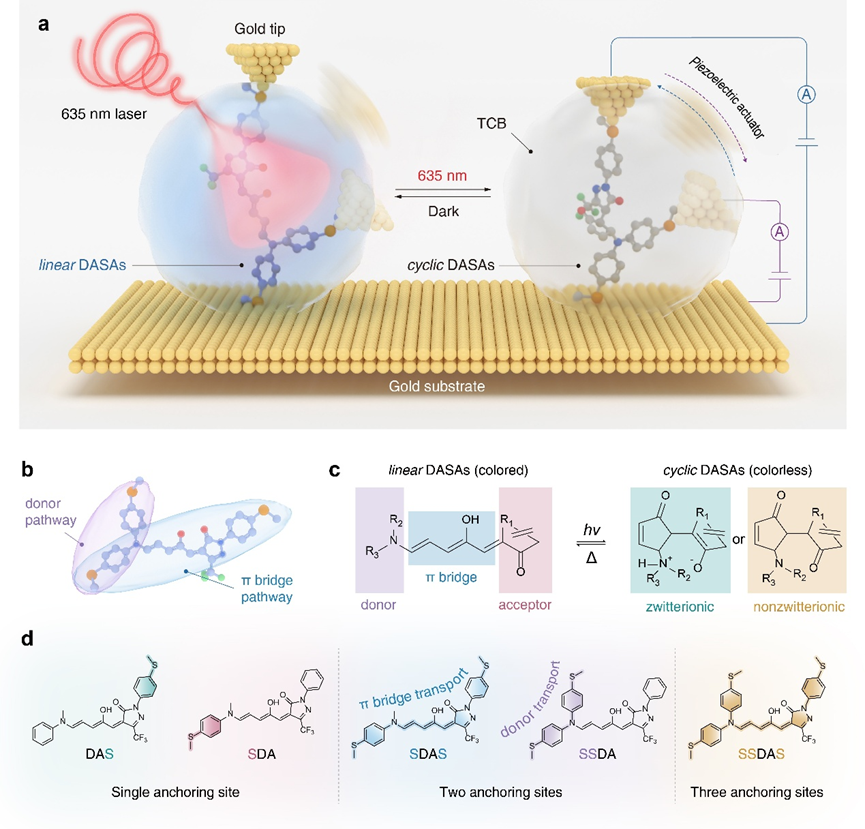 该研究的核心思路在于通过光照引发的linear-cyclic异构化精准调控单个DASAs分子结中的两条电子传输路径:电子给体路径(donor pathway)以及三烯π桥路径(π bridge pathway)。研究团队利用扫描隧道显微镜断裂接点(STM-BJ)技术,深入探讨了635 nm激光照射下两条电子传输路径的电导能力变化,并通过合成一系列含有不同数量硫甲基锚定位点的DASAs,展示了通过光照同时调控单分子内多条电导通路的潜力(图1)。