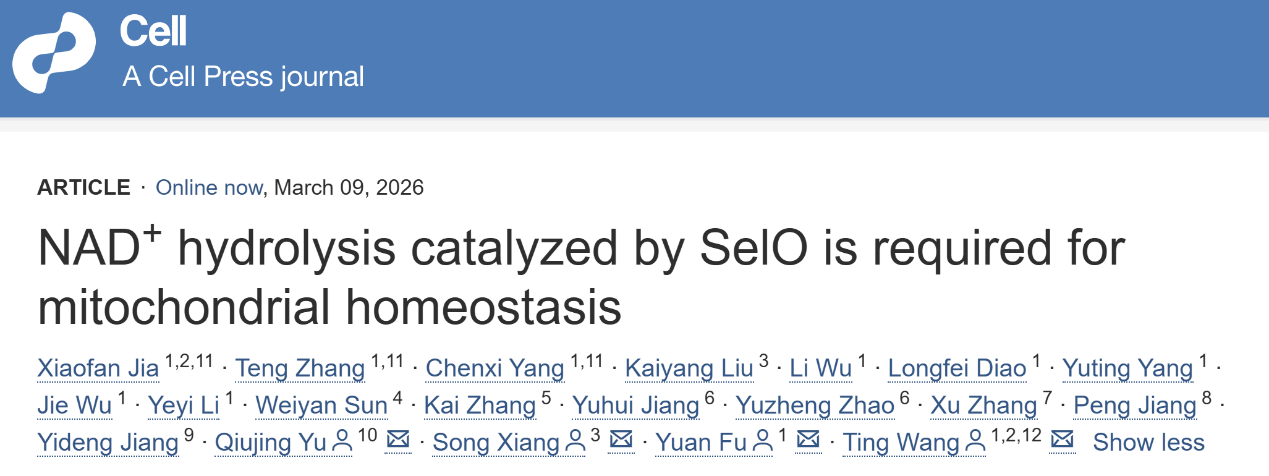 3月9日,医学院王霆及余秋景教授作为共同通讯作者在《Cell》上发表了题为"NAD+Hydrolysis Catalyzed by SelO is Required for Mitochondrial Homeostasis"的研究论文。电子科技大学为第二单位,天津医科大学为第一单位。这项研究揭示了线粒体中的NAD水解代谢反应及水解酶SelO,阐明了SelO在线粒体代谢压力反馈调控和线粒体稳态维持中的重要作用。