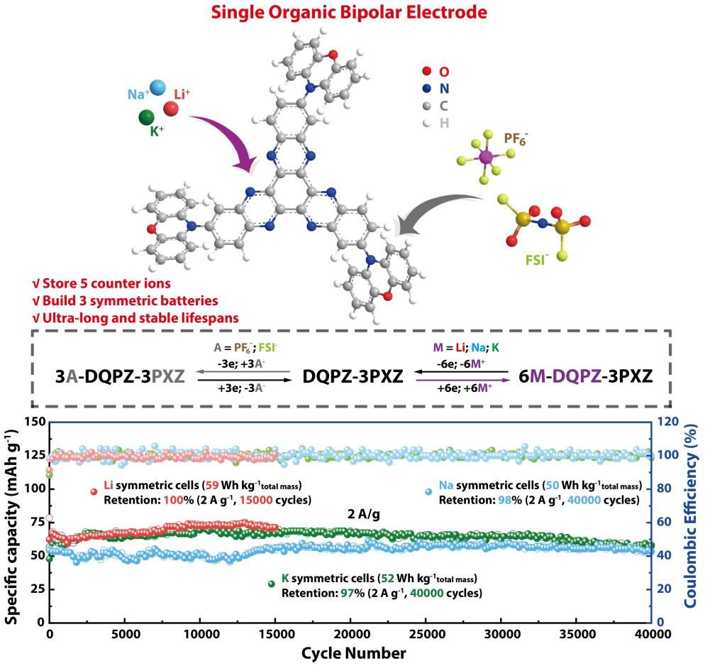 更引人注目的是,基于大π共轭的稳固有机固体结构抑制了DQPZ-3PXZ在电解液中的溶解,所有对称电池均具有超过15000次的循环寿命,且不会出现明显的容量衰减。特别对于K基双离子对称电池,显示出91000次循环的超稳定和超长寿命。该研究成果证明了有机电极材料具备“单分子储能”的能力,并为有机电极材料的商业化应用奠定了基础。