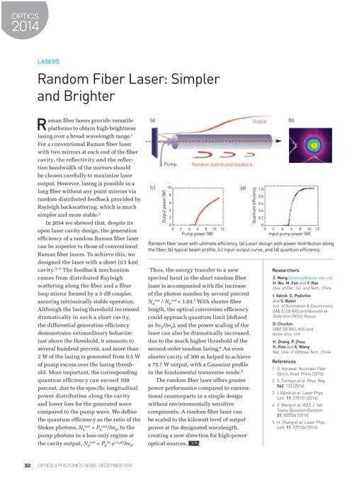 近日,据国家自然科学基金委员会网站“基金要闻”报道,电子科技大学饶云江教授(杰出青年基金获得者、OSA/SPIE Fellow)团队、国防科技大学周朴研究员(优秀青年基金获得者)团队在国家自然科学基金重大项目课题(61290312)与青年基金项目(61205048)支持下,在随机光纤激光器领域取得突破性研究进展,相关成果入选由美国光学学会(OSA:Optical Society of America)组织评选的2014年全球光学重要进展。近日,该学会旗舰杂志《Optics & Photonics News》(OPN)2014年12月专刊《Optics in 2014》以“Random Fiber Laser: Simpler and Brighter”为题对该成果进行了亮点报道。