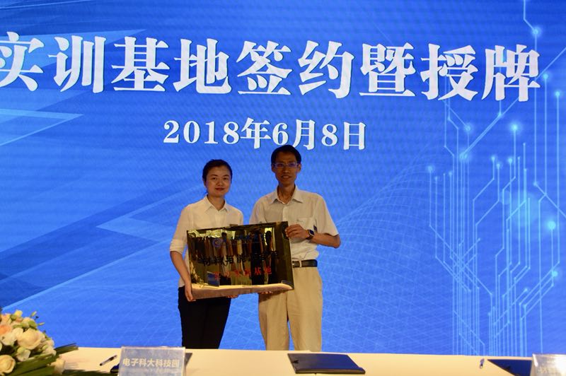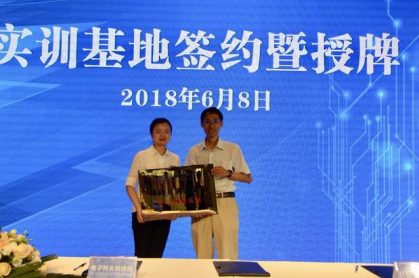 周海涛、刘治旭、王萍共同签署校院企地战略合作协议。周海涛与王萍代表双方签署人才实训基地协议,并向电子科大科技园(天府园)授牌。