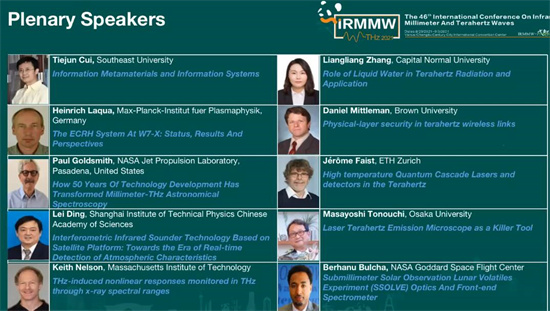 在随后的几天里,崔铁军、中国科学院上海技术物理研究所研究员丁雷,瑞士苏黎世联邦理工学院教授Jérôme Faist,IRMMW-THz 2021 K.J Button Prize获得者、美国宇航局喷气推进实验室Paul Goldsmith,德国卡尔斯鲁厄理工学院Heinrich Laqua,日本大阪大学教授Tonouchi Masayoshi,美国布朗大学教授Daniel Mittleman,美国麻省理工学院教授Keith Nelson,首都师范大学研究员张亮亮将分别做大会报告(Plenary Talk)。