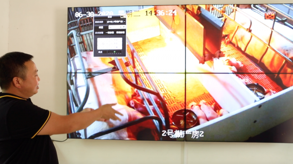 Local pig breeder Zheng Peikun shows his system of smart pig breeding. /CGTN