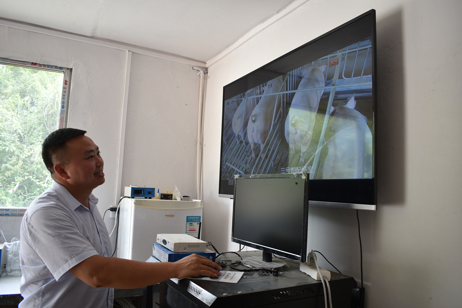 郑培坤通过远程视频监控查看圈舍内情况(资料图片)