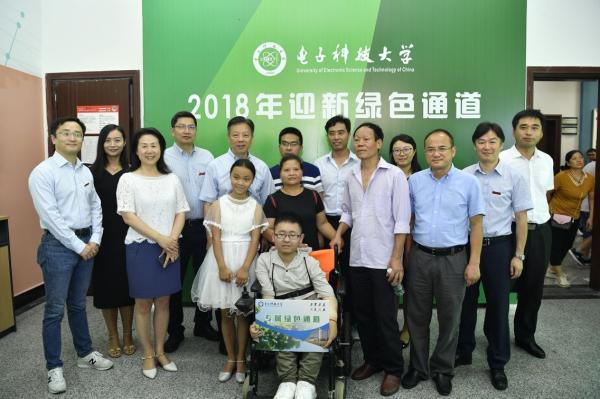 “祝贺你成为成电人!”8月31日上午,来自贵州省六盘水市的“轮椅少年”袁好男在父母、妹妹和其母校——六盘水第八中学校长卢彦、班主任唐大旺等亲人的陪同下,来到电子科技大学清水河校区报到入学,电子科大相关负责人来到报到现场看望袁好男,并为其别上了该校校徽。