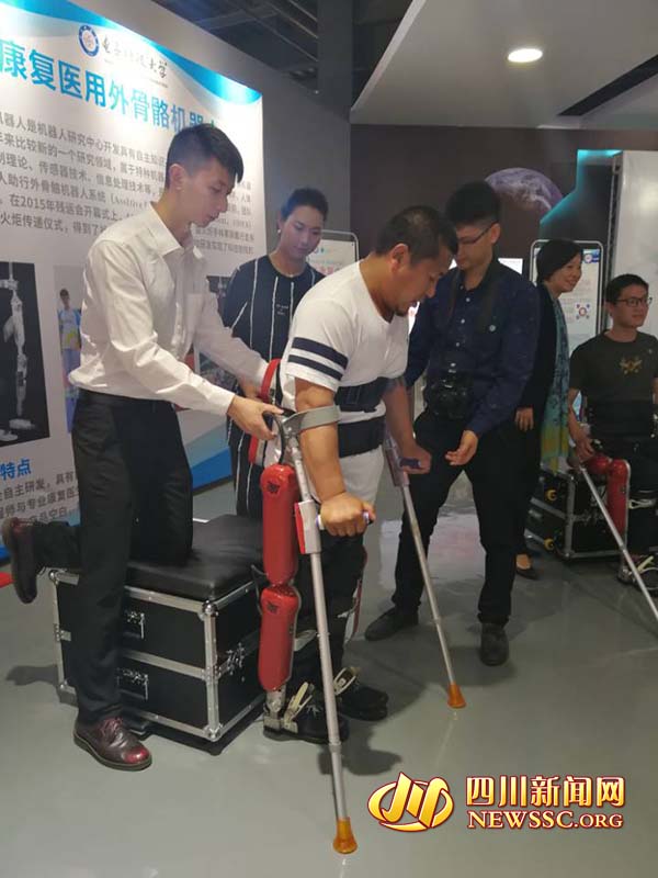 马志杰穿上医用外骨骼机器人后,10年来第一次从轮椅上站了起来。