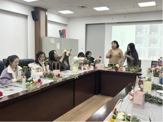 插花现场,花香四溢,沁人心脾,花艺老师详细讲解了插花的基本技巧,并指导各位老师如何选材和制作插花。