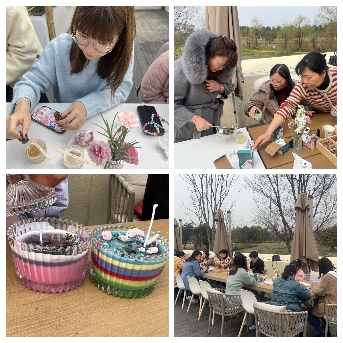 活动伊始,工作人员首先向女教职工们讲解了香薰蜡烛的功效和制作过程,而后进行材料分发,引导女教职工进行制作。老师们拿到材料后跃跃欲试,立刻进入了手工制作过程。通过融化豆蜡、调制颜色、添加精油、降温凝固,很快便有阵阵香气萦绕在周围,沁人心脾,令人身心放松。蜡液在半凝固状态时,大家根据自己的喜好加入干花瓣装饰。在芳香弥漫的氛围中,形成一个个独一无二、充满浪漫气息的艺术品。