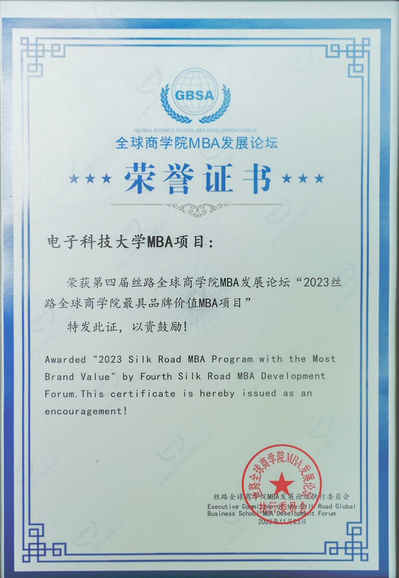 电子科技大学MBA项目荣获“2023丝路全球商学院最具品牌价值MBA项目”奖。该奖表彰在MBA教育和人才培养中不断创新,锐意进取,提升学员、校友幸福感和荣誉感的MBA项目。
