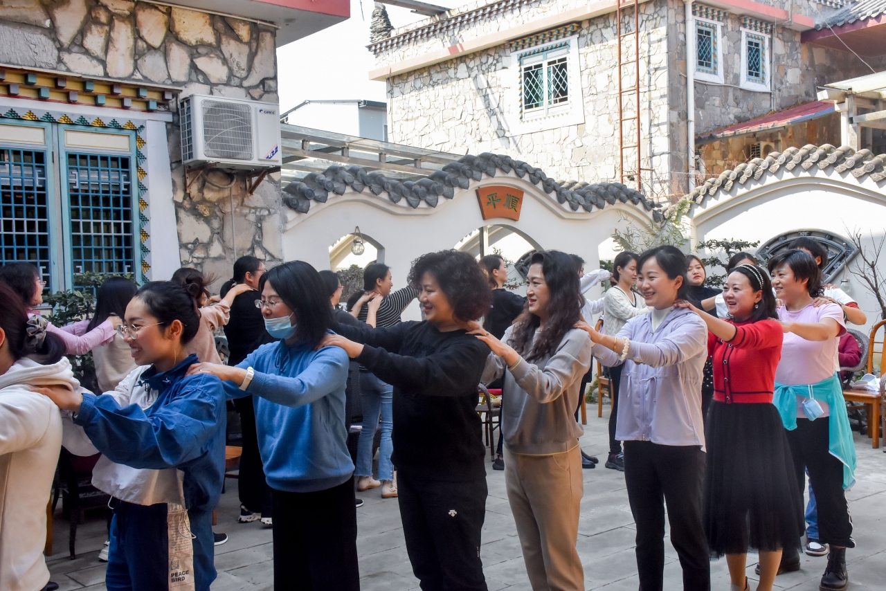 “你是那夜空中最美的星星,照亮我一路前行,你是我生命中最美的相遇,你若安好便是晴天……”伴随着《早安隆回》充满韵律感和节奏感的音乐响起,再一次唤醒了老师们活动后略显疲惫的身体。大家在郭斌老师和刘成圆老师的带领下,学习了《早安隆回》的舞蹈,在充分掌握舞蹈手势和舞步节奏后,老师们在油菜花田的路边进行了舞蹈表演,生动展示了学院女教职工多才多艺展英姿,满怀豪情迎未来的精神面貌。