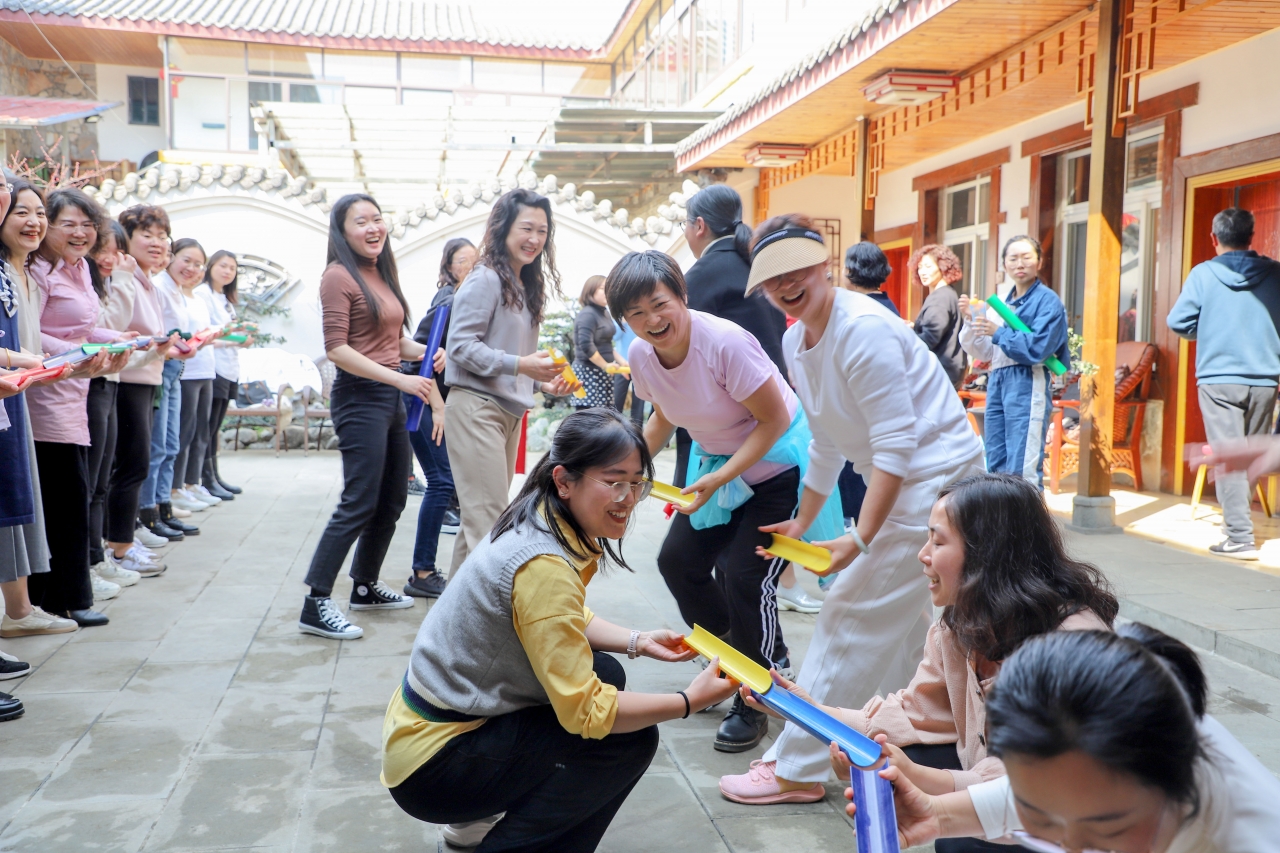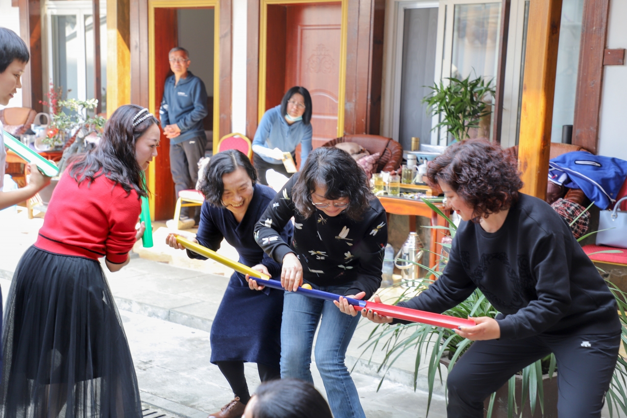 下午,结束花海午餐后,老师们步行至综合示范基地附近的农家小院开展素质拓展活动。在教练的指导和要求下,老师们陆续进行了相互捏肩、捶背、头部按摩,四肢伸展等热身运动,逐步舒展身体,释放压力,愉悦心情。随后,分三个小组开展了接力运送乒乓球比赛,大家认真了解比赛规则,自动组织赛前训练,经过模拟演练后迎来正式比赛,每组队员都聚精会神,团结一致全身心投入趣味比赛中,在比赛中增进交流与互动,增强团队凝聚力。