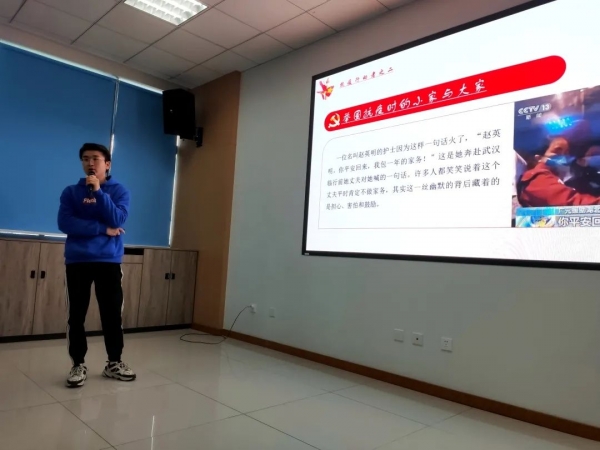 刘涛同学讲授的微党课主题是举国同心。举国同心的抗疫精神集中体现了中国人民万众一心、同甘共苦的团结伟力。14亿中国人民同呼吸、共命运,肩并肩、心连心,绘就了团结就是力量的时代画卷!