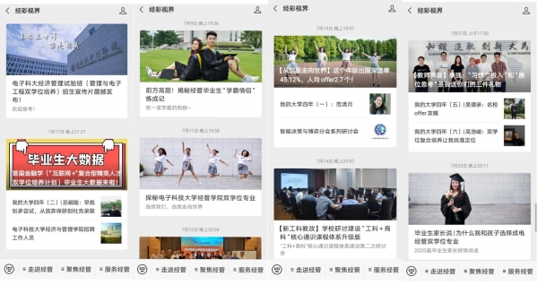 经管学院大力通过微信公众号、招生咨询QQ群等网络宣传渠道进行专业介绍。在经管学院“经彩视界”微信公众号上持续推出“经彩毕业生”“我的大学四年”等专栏,介绍优秀毕业学子在经管四年的学习成长轨迹;精心策划推出了“学霸情侣”“从这里走向世界”“毕业生大数据”“毕业生家长说”等栏目,介绍学子丰富多彩的校园生活、毕业走向、人才培养成效和发展前景等,从学生层面反映专业培养特色,从家长层面见证孩子的成长收获与变化,用毕业生数据真实展现经管双学位专业的优势。