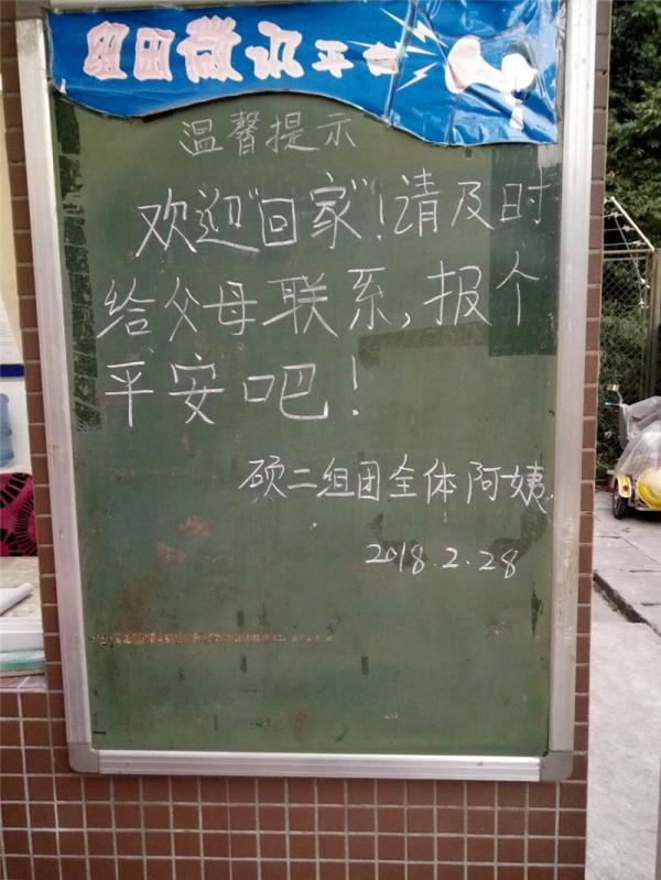 新学期,为了给同学们营造一个舒适、安全、整洁的住宿环境,阿姨们认真梳理检查各楼栋及组团内环境卫生,地面、门禁、大门栏杆都被保养擦拭的一尘不染,光可照人。宿舍大门前悬挂的灯笼,黑板上写着了“欢迎同学回校!”的话语,让归来的同学们感受到“家”的温暖。