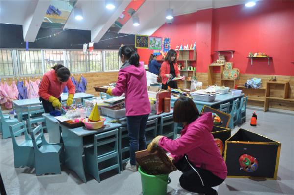 幼儿园老师们将幼儿玩具、餐用具进行仔细的消毒,并布置出温馨的班级环境,迎接孩子们放假回来。