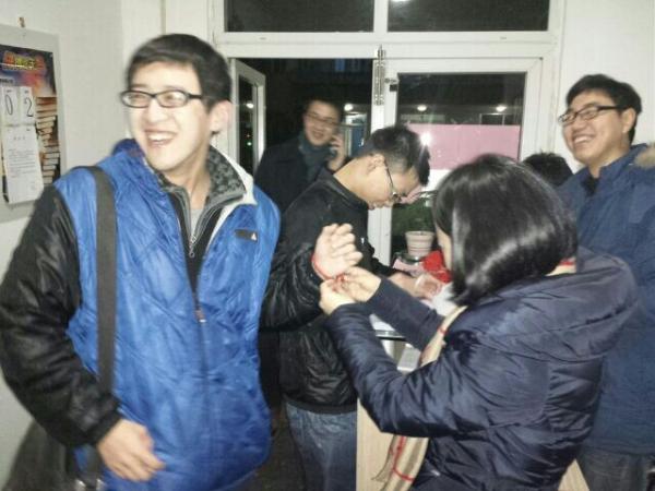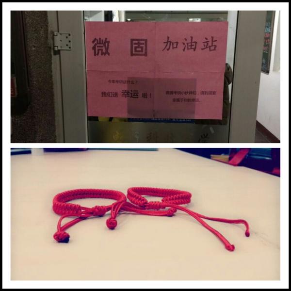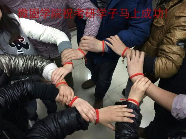 2015年硕士研究生入学考试前夕,为了给考研同学们加油鼓劲,12月25日晚上,微固学院党委副书记张媛媛、学生科科长于淼、本科11级辅导员文译、武剑以及热心的保研同学一行12人组成考研助威团,走进学生宿舍,为考研复习回来的同学们送上精心准备的幸运手绳。