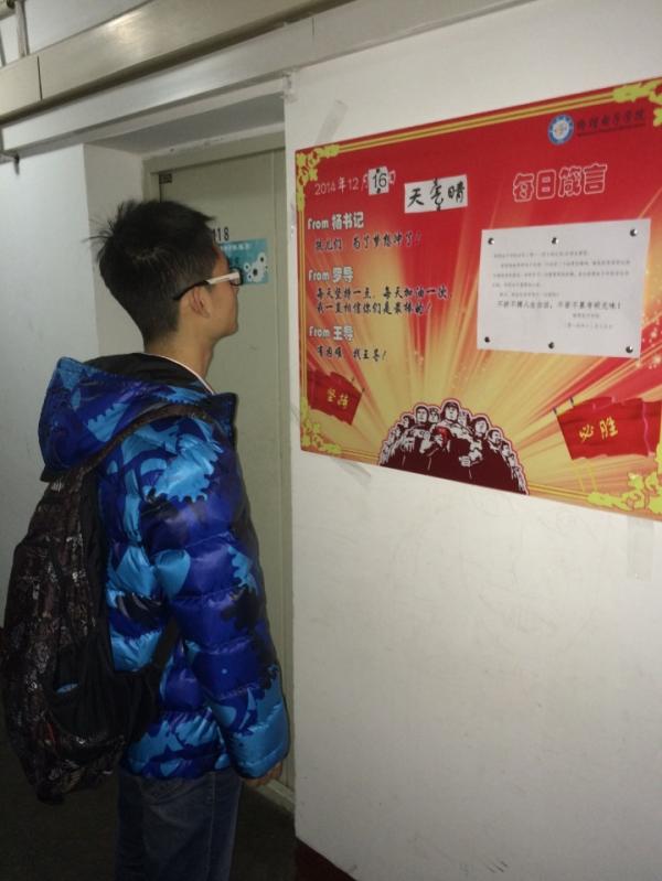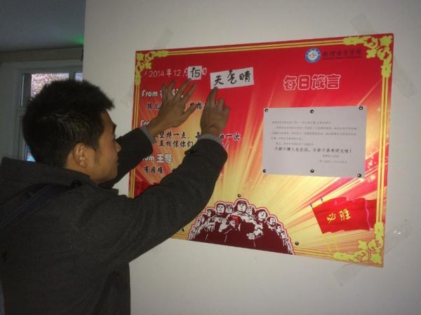 寝室走道的考研信息提示板,贴心的天气预报,激励人心的每日箴言,还有师兄师姐的考研小贴士,副书记和辅导员的温馨寄语。这里记录着心情,也记录着大家忙碌经过的身影。